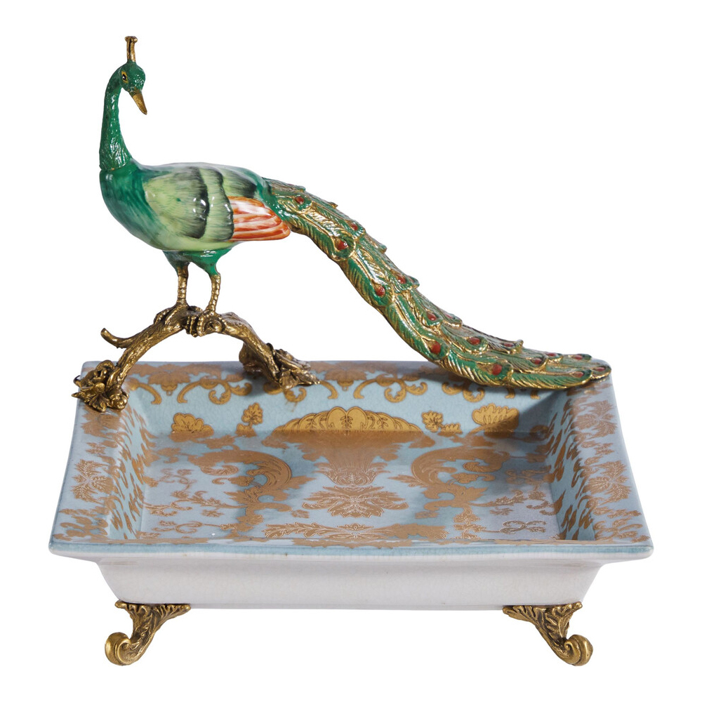 Блюдо квадратное с павлином на бронзовых ножках Eden Garden Голубой Бронза Мульти в Ульяновске | Loft Concept